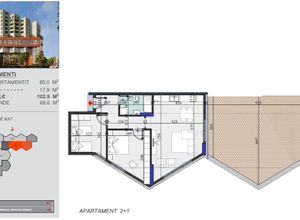 Apartamenti 2+1 me sipërfaqe 102.9 m² ndodhet në katin e 14 të godinës Colonnade, e cila aktualisht është në fazat përfundimtare të ndërtimit në Rrugën Dritan Hoxha, Laprakë. Projekti përfaqëson një nga zhvillimet më moderne të zonës, duke ofruar standarde të larta ndërtimi dhe një arkitekturë bashkëkohore. Pozicioni i apartamentit në kat të lartë siguron pamje të hapura dhe ndriçim natyral gjatë gjithë ditës. Apartamenti disponon gjithashtu një verandë të gjerë, e cila shton komoditet dhe hapësirë të jasht...