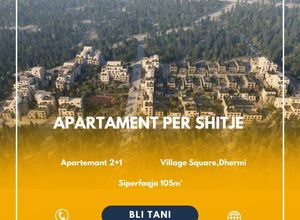 Shitet apartament 2+1 me sipërfaqe totale 105 m² në Village Square, Dhërmi. Apartamenti ka një planimetri funksionale me ambient ndenjeje dhe kuzhinë të përbashkët, dy dhoma gjumi dhe tualet, duke ofruar hapësira të bollshme dhe të ndriçuara natyralisht. Kompleksi ofron ambiente të përbashkëta të mirëadministruara dhe siguri, dhe ndodhet në një zonë të qetë dhe të kërkuar, pranë plazhit dhe shërbimeve kryesore. Apartamenti është ideal për banim pushimesh ose si investim turistik.