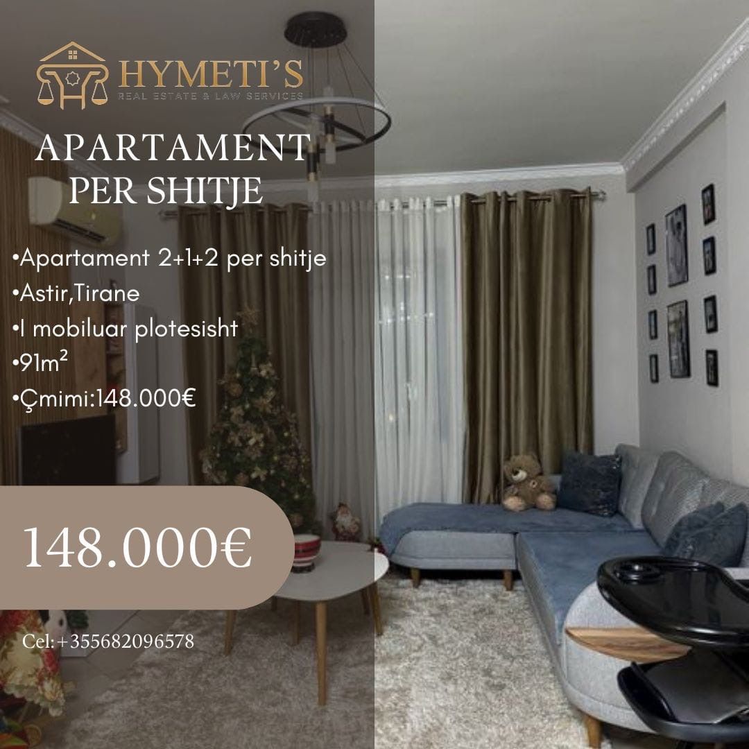 Apartament 2+1+2 në Astir, Tiranë, me sipërfaqe 91 m², i pozicionuar në katin e 3-të të një pallati me ashensor. Apartamenti ka organizim funksional me sallon dhe kuzhinë të përbashkët, dy dhoma gjumi dhe dy tualete, duke ofruar komoditet për një familje. Ndodhet në një zonë të zhvilluar dhe të aksesueshme, pranë shërbimeve kryesore dhe transportit publik. Çmimi: 148,000 €.