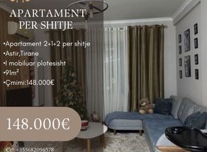 Apartament 2+1+2 në Astir, Tiranë, me sipërfaqe 91 m², i pozicionuar në katin e 3-të të një pallati me ashensor. Apartamenti ka organizim funksional me sallon dhe kuzhinë të përbashkët, dy dhoma gjumi dhe dy tualete, duke ofruar komoditet për një familje. Ndodhet në një zonë të zhvilluar dhe të aksesueshme, pranë shërbimeve kryesore dhe transportit publik. Çmimi: 148,000 €.